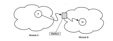Fig 2. Two modules communication through a mailbox (Bertolotti)A communication link or a channel is said to exist between producers and consumers. At the very least the channel will support two primitives: send and receive. This link has the following properties: