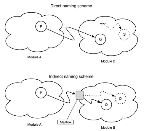 Naming can be direct or indirect. Indirect naming means the communicating tasks will use the channel’s name to send to and receive from. On a direct channel, the send() gets a task ID as argument.
