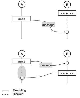 Fig 4. On top, a consumer sleeps waiting for a message. Below, a producer sleeps waiting for a successful send.Unbuffered Message-Passing