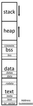 Together, these components form the runtime memory layout, sometimes called the runtime image, as depicted in the picture, with the specific .isr_vector symbol for the ARMv6/7M vector table. (Just so you know: formally, an execution image does not include stack and heap).